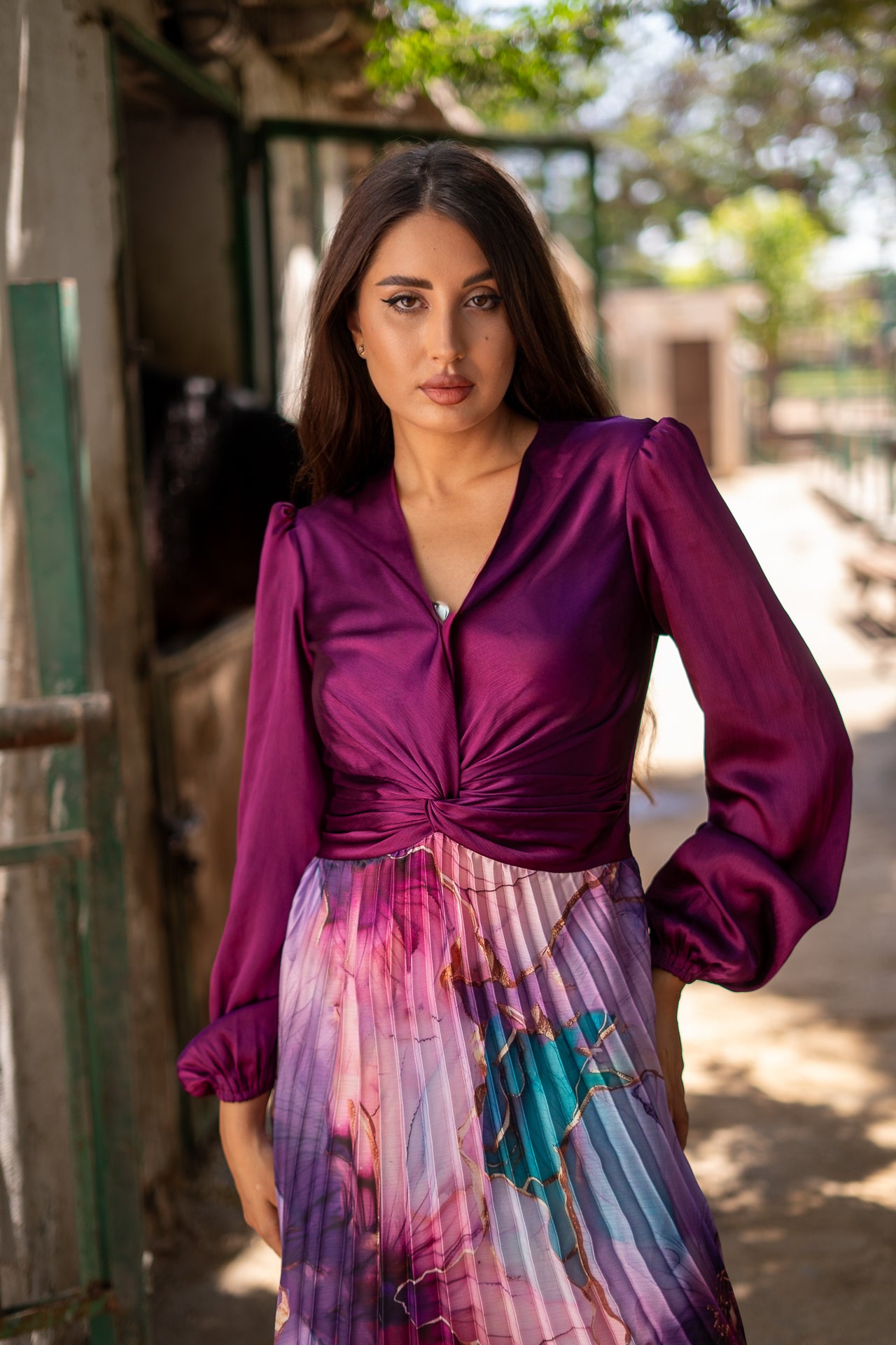 Burgundy pleated jumpsuit with gold chain belt with sleeves