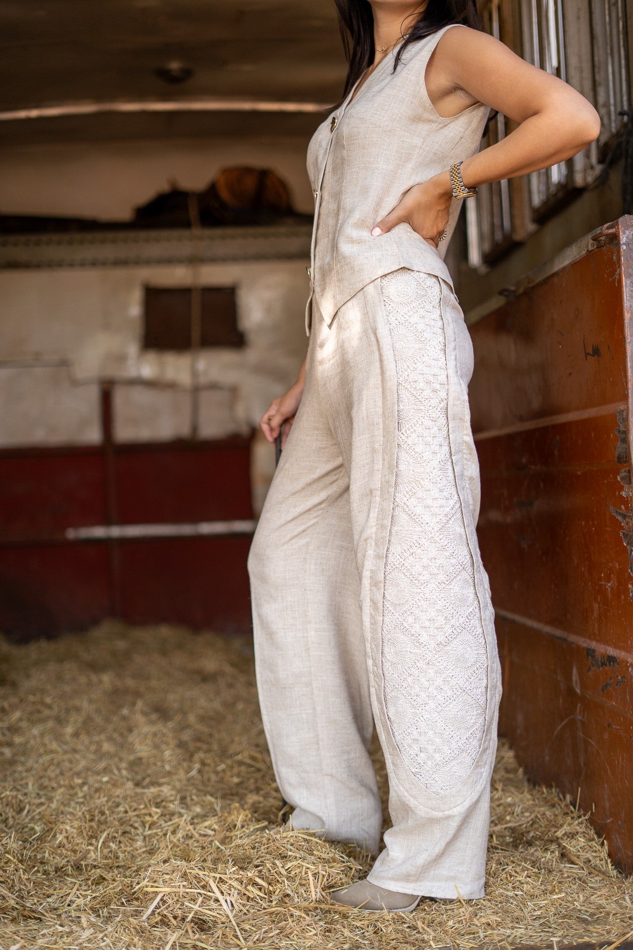 A modern two-piece linen set designed for effortless sophistication. The tailored vest pairs perfectly with a straight pants, giving structure while staying lightweight and breathable. The pants are elevated with delicate side handmade crochet, adding a touch of refinement to the clean silhouette.