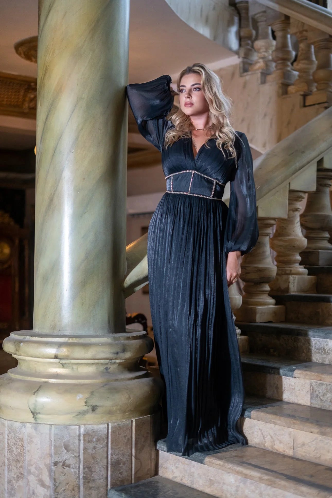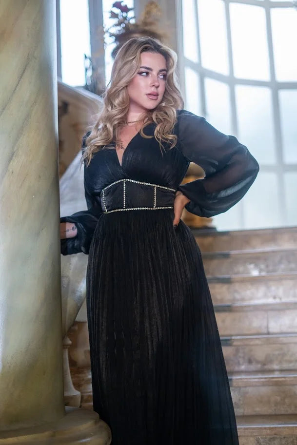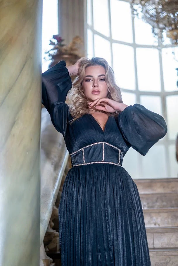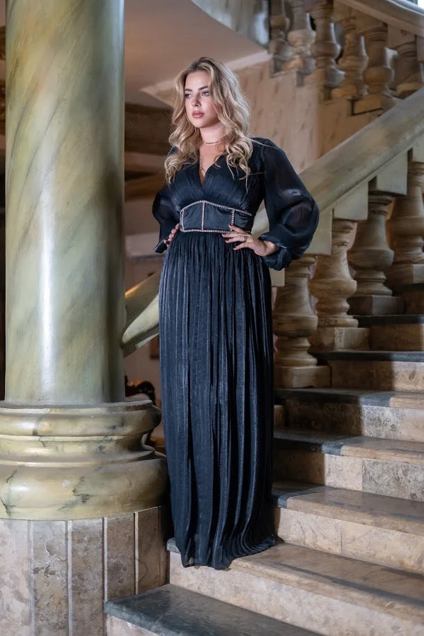 Black Silk Chiffon Pleated Dress With Diamond Corset