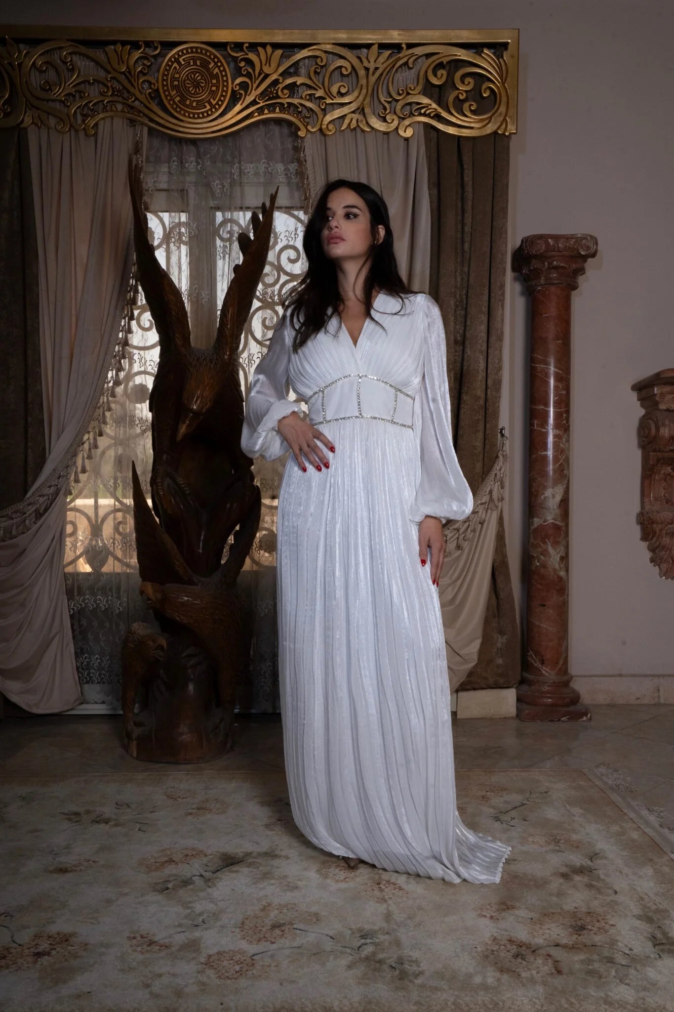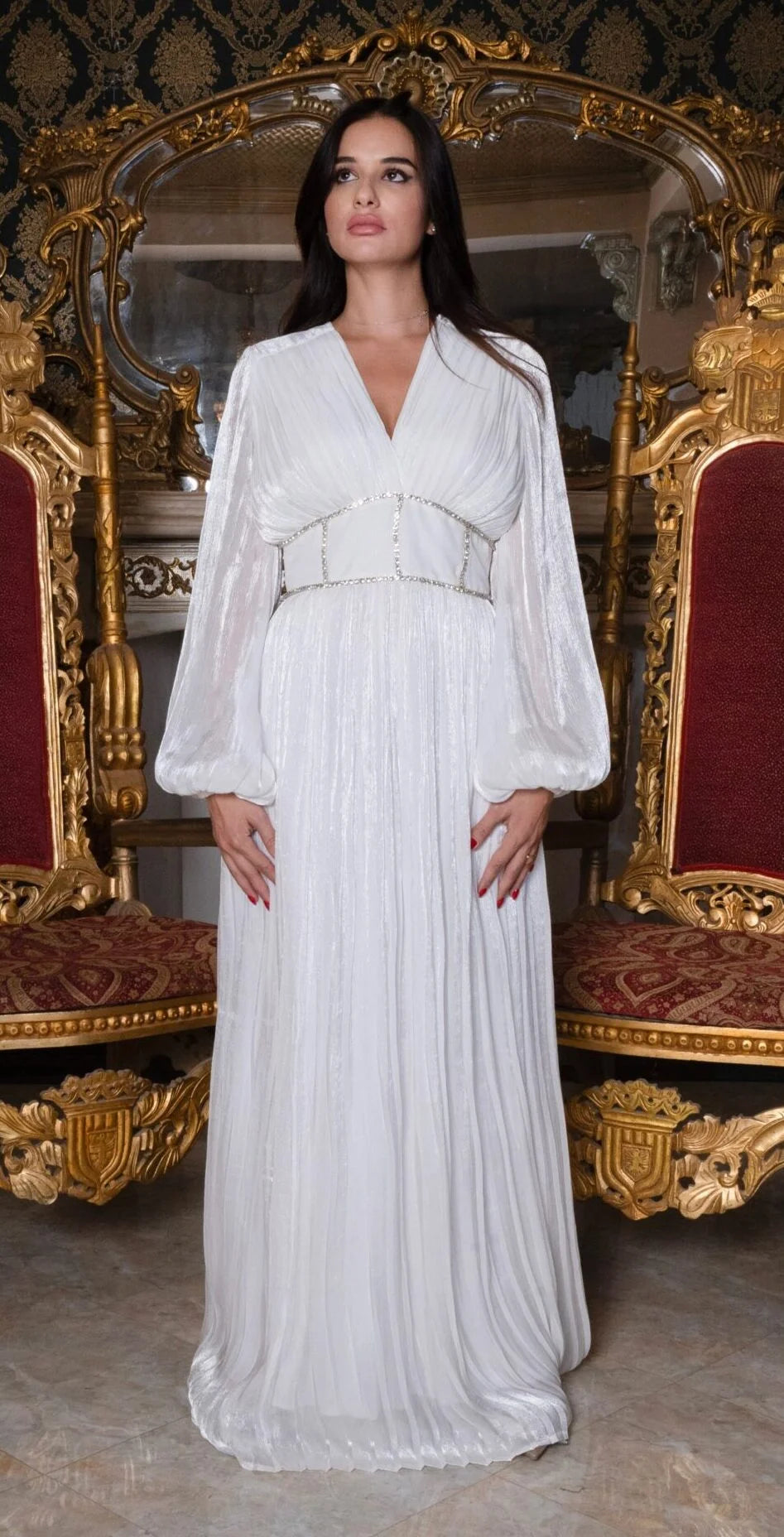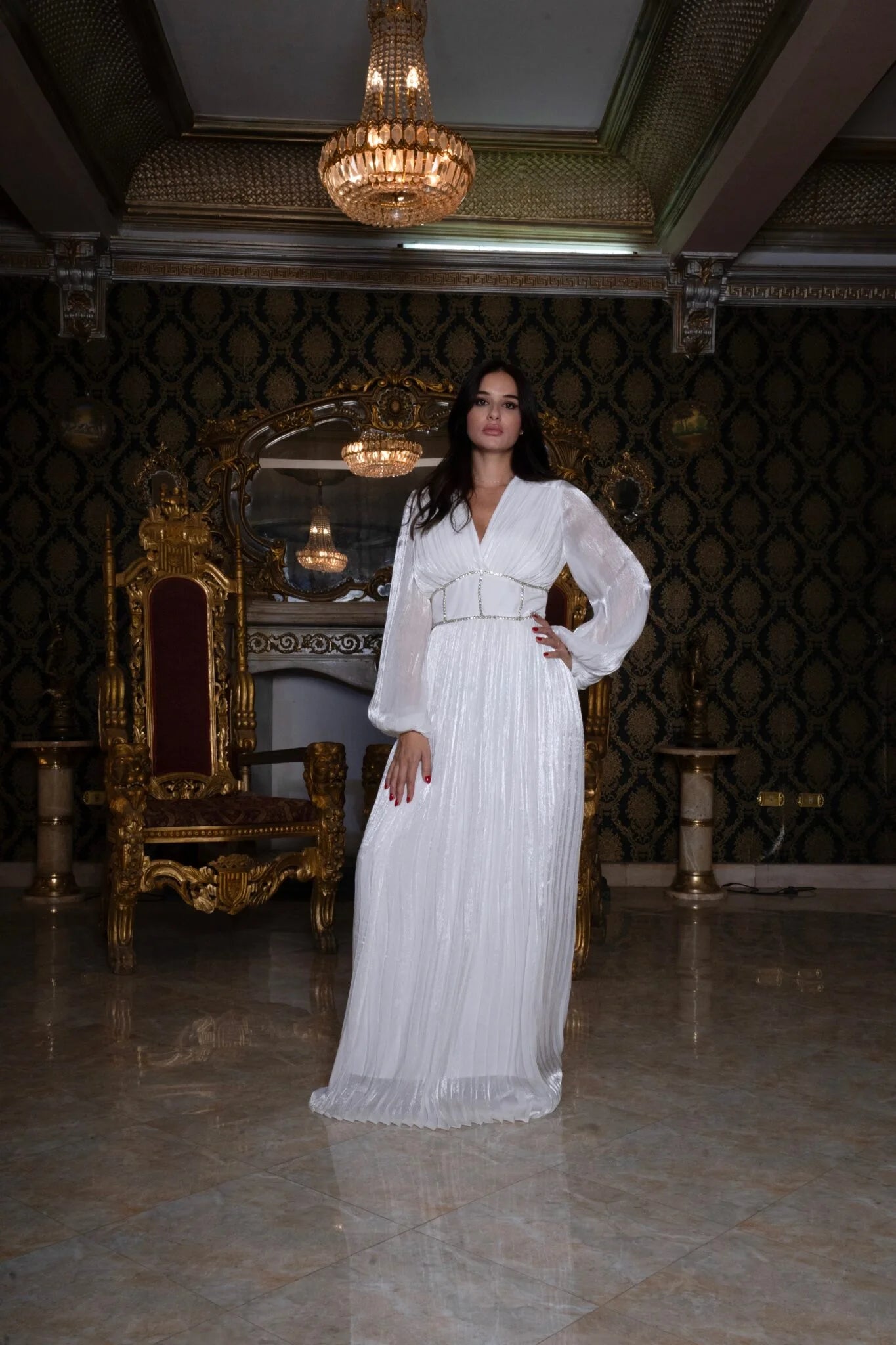 White Silk Chiffon Pleated Dress With Diamond Corset